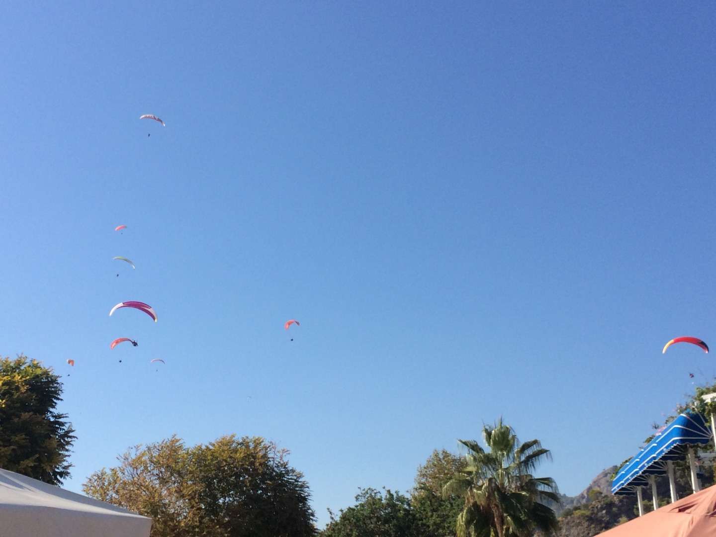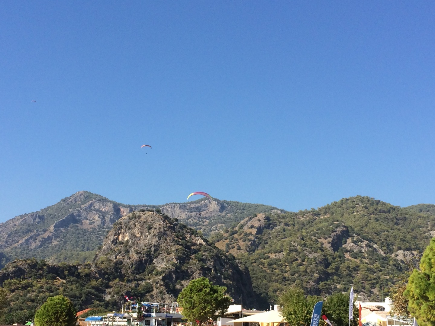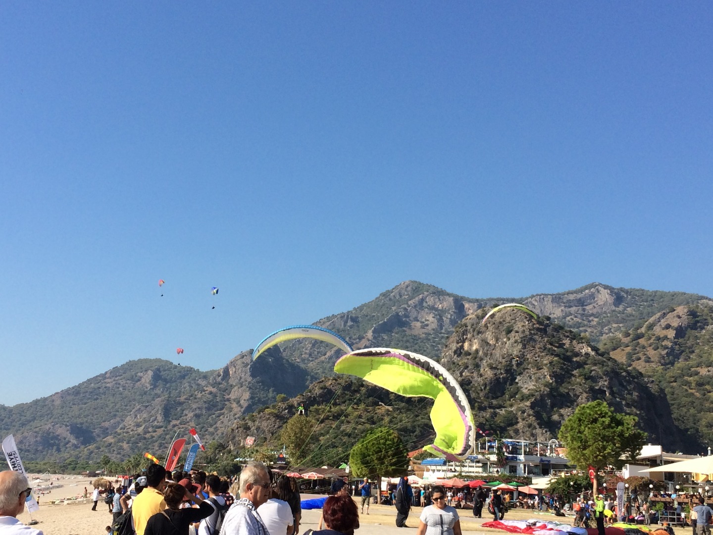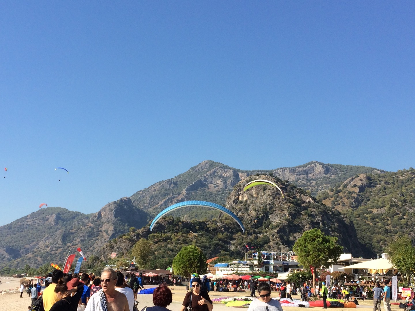 The flight over the coast of Fethiye ends with a landing in the village of Oludeniz. All the paragliders are landing directly on the promenade along the main beach, or on the beach itself.